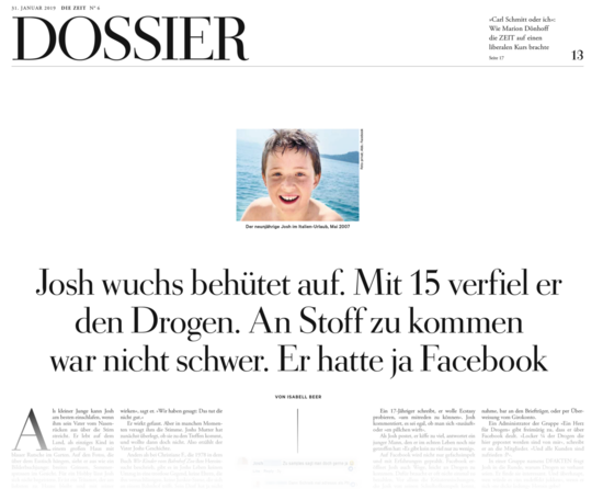 "Josh wuchs behütet auf. Mit 15 verfiel er den Drogen. An Stoff zu kommen war nicht schwer. Er hatte ja Facebook." DIE ZEIT, ZEIT Online, 31. Januar 2019